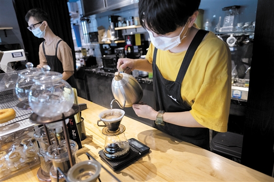 “7M CAFE咖啡店生意很不错,在江门、佛山都有店面。”7M CAFE咖啡店(万科店)店长黎敏怡说,咖啡能提神醒脑,不少中青年人都喜欢在早餐和下午茶时间喝咖啡,有些人还喜欢到咖啡店办公,品尝香醇的咖啡、享受优雅的环境。