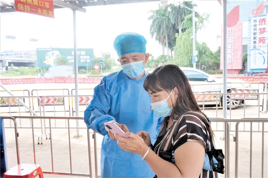 “请打开‘粤核酸’葵花码,记得截图保存。”“您之前做过粤核酸6吗?”……7月23日下午3点,在外海高速收费站前的核酸采样点,朱树晃不厌其烦地提醒前来检测核酸的群众打开手机上的葵花码。当天的温度高达38摄氏度,身穿防护服的朱树晃早已汗流浃背,他笑着说:“习惯了。”这一天是他奔走于疫情防控一线的第16天。