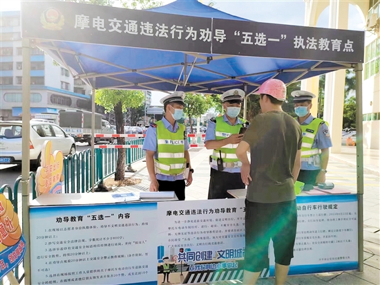 7月20日下午5点多,正是下班高峰期,记者在位于开平市三埠街道的城市南广场红绿灯处看到,现场交通秩序井然,此前曾受市民群众诟病的电动自行车走机动车道、闯红灯、逆行等现象明显减少。而不远处的摩电交通违法行为劝导“五选一”执法教育点,偶尔也会迎来因为违反交通规则需要接受“五选一”教育劝导的市民。