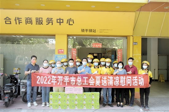“感谢上周开平市总工会送来的清凉饮品,让我们站的快递小哥在炎炎酷暑中感受阵阵清凉以及工会组织的关心。”昨日,顺丰速运虹桥路店负责人张乐荣说。记者了解到,开平市总工会于7月19号启动了2022年夏送清凉慰问活动,为炎炎夏日奋战在一线的职工群众送去关怀,保障职工的身体健康和生命安全。