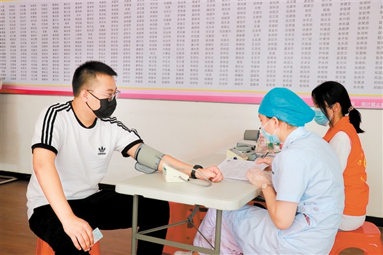 炎炎夏日,挡不住保险人的献血热情。当天早上8时许,献血者们纷纷来到市中心血站。测温、扫粤康码后,献血者们戴着口罩,有序填表、量血压、验血……按照疫情防控要求,市中心血站将填表、量血压、验血等处设置在不同地方,有效避免了人群聚集。