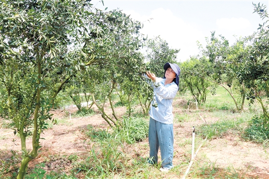 7月盛夏,骄阳似火。在新会区双水镇蓢头村的柑人汇庄园,工人们正顶着烈日,穿梭于果树间。
