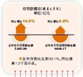 人民银行江门市中心支行公布的数据显示,上半年,江门金融运行情况总体平稳,存贷款保持平稳增长,制造业和基础设施业贷款增速较快,流动性合理充裕,企业融资成本实现稳中有降。截至6月末,全市本外币贷款余额5385.88亿元,同比增长10.5%;本外币各项存款余额6484.17亿元,同比增长8.8%;存贷比达到83.1%,排名全省第八,比去年同期提高1.3个百分点。