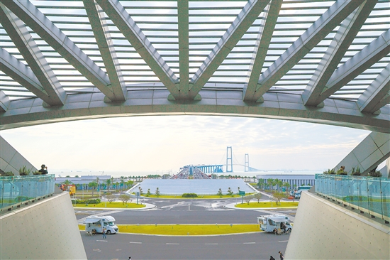 10月25日,深中通道西人工岛开启文旅试运营,首批约百位媒体记者和游客抵达西人工岛体验超级工程文旅之行。深中通道全长约24公里,集“桥、岛、隧、水下互通”于一体,2024年6月30日正式通车。图为当日,在深中通道西人工岛中庭的观景平台拍摄的深中大桥和西人工岛景观。 新华社发
