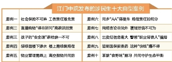 江门日报讯 (记者/凌雪敏) 民生是人民幸福之基、社会和谐之本,司法是保障民生权益的重要防线。近日,江门市中级人民法院发布涉民生十大典型案例,涵盖社会保险、直播购物、校园安全、邻里纠纷、高空抛物、好意同乘、网络名誉、金融诈骗、医保安全、生态保护等与群众日常生活息息相关的领域,以期通过典型案例发布,明晰法律边界,划定行为底线,向社会传递法治温度与价值导向,同时引导广大群众增强法治意识,推动社会各界共同营造尊法学法守法用法的良好氛围,以法治力量守护民生福祉,共筑和谐稳定的社会秩序。