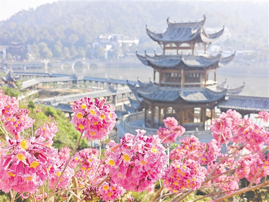 目前,成片的紫花风铃木已经进入了最佳观赏期,不少闻讯而来的游客穿梭在这片童话般的花海里,用镜头定格下最美的瞬间。从远处望去,连绵的山坡已被柔软如云的粉紫色完全覆盖。成片的花树汇聚成海,在冬日阳光下,泛起一层朦胧的、梦幻般的光晕,宛如天地间一幅轻柔的油画,又像是一片坠入人间的紫色云霞,气势温柔却磅礴,为寒冷的冬日增添了一抹亮丽的景致。