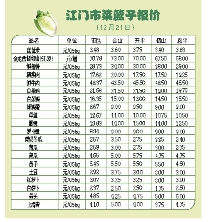 据本市21家农贸市场监测数据显示,上周市场上各类“菜篮子”商品供应充足,所监测的7大类“菜篮子”商品价格环比总体表现为1涨5跌1平,其中粮油类商品价格以稳为主,肉类、蔬果类、水产类商品价格总体略降,禽蛋类商品价格稳中略涨。