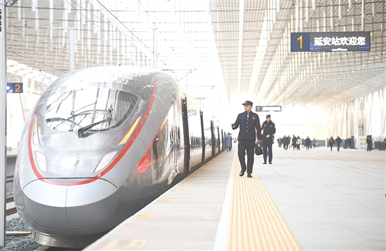 “从上世纪90年代开行时速几十公里的普速列车,到2012年开行时速160公里动车组,再到如今建成时速350公里高铁,革命老区人民终于圆了高铁梦。”扎根延安铁路30余年的延安站副站长吴兴文说。