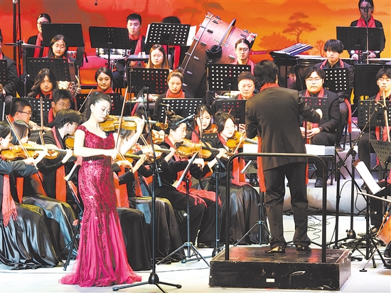 现场,民族经典曲目尽显深厚底蕴,《春节序曲》洋溢欢腾喜乐,《瑶族舞曲》勾勒民族风情;西方经典作品各具特色,《查尔达什》的吉普赛风情在琴弦上奔流,莫扎特二重唱尽显喜剧智慧。此外,中国竹笛与西方管弦乐器共同演绎的《挂红灯》恢弘大气。