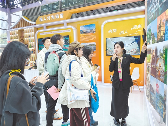 一踏入江门馆,江门的区位交通优势、深厚历史底蕴、优质营商环境等核心竞争力被系统呈现,让求职者快速了解这座城市的发展潜力。科技感拉满的摩托车、超导电动高速磁浮列车及“海洋地质二号”科考船模型等前沿科技产品,直观呈现了“江门制造”向“江门智造”跃升的产业实力。