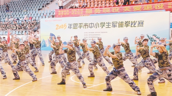 江门日报讯 (文/图 记者/张安怡) 7月11日,恩平市体育中心体育馆内彩旗飘扬,气氛热烈,2025年恩平市中小学生军体拳比赛在这里如期开赛。来自恩平全市40所学校的参赛队伍齐聚赛场,用刚劲有力的动作彰显青春风采。