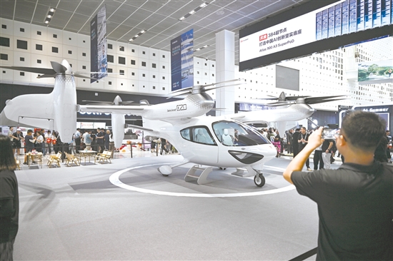 图为7月26日在2025世界人工智能大会拍摄的时的科技电动垂直起降飞行器。据工作人员介绍,该产品具备智能驾驶功能。 新华社发