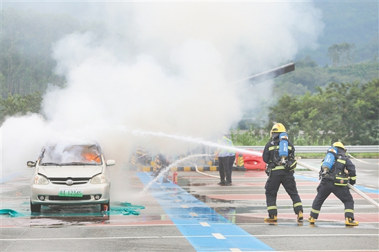 江门日报记者 (文/图 敖转优 通讯员/丘艳芳) “报告,梁金山服务区有一辆正在充电的车辆发生自燃,现场浓烟滚滚,火势发展迅速……”近日,在广东交通集团所属开阳高速梁金山服务区,举办了一场专门针对新能源车辆起火的消防演练。