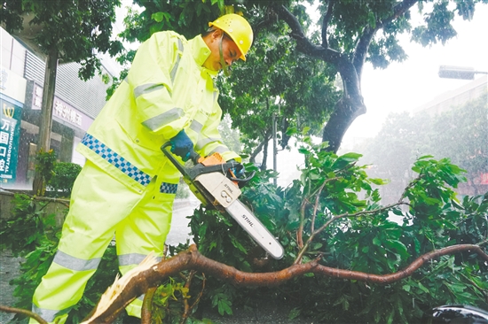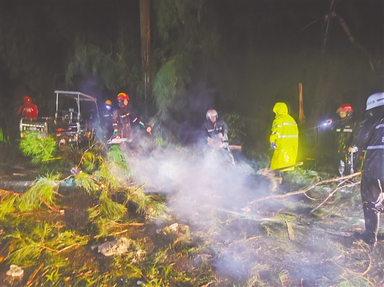 “路不通,我们就清出一条路!”吴绍宗等民辅警没有犹豫,拿起电锯下车作业。在狂风暴雨中,电锯轰鸣,一段段树木、树枝被移开,一条生命的通道一点点向前延伸。