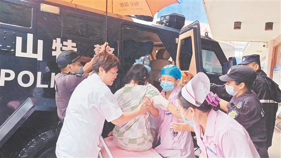 台风“桦加沙”侵袭台山,端芬镇隆文村临产孕妇因道路被倒伏树木阻断无法送医,台山民辅警冒雨用电锯开辟通道、驾装甲车护送,最终将孕妇平安送达医院。台山公安供图