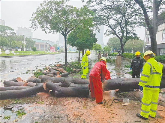 城管部门抢险队伍使用油锯将倒伏树木锯断并清运,保障道路通行安全。 郭永乐 摄