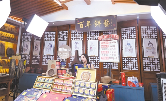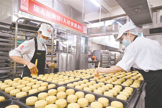 当前,各地加紧制作月饼,供应中秋节日市场,月饼消费越来越热。上图为近日,在广西柳州市一家百年糕点企业里,主播在生产车间外直播销售月饼。右图为在该企业生产车间,工人忙着制作月饼。新华社发