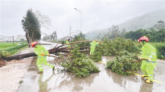 江门日报讯 (文/图 记者/冯瑶君 通讯员/古井宣) 台风“桦加沙”携狂风呼啸而至,威力强劲,对古井镇多地造成影响。昨日上午,古井镇岭东北路段遭遇险情——几棵大树在狂风冲击下倒伏,粗壮的树干横亘在道路中央,茂密的枝叶散落四周。接到群众报警后,古井镇消防队救援人员携带专业设备火速赶赴现场。