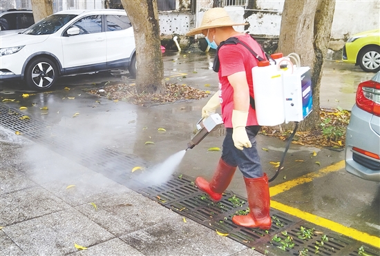 9月20日清晨,鹤山市各学校迅速组建教师消杀志愿队,联合专业消杀人员对校园重点区域进行精细化灭蚊作业。专业消杀人员携带喷雾设备,依据科学配比调配药剂,对教学楼走廊、卫生间,操场绿化带、排水沟,食堂储物间、垃圾桶周边等蚊虫易栖息、孳生的角落逐一喷洒。与此同时,教师们分组行动,化身“环境清理卫士”,有的清扫操场及校园周边的枯枝落叶、生活垃圾,有的检查教学楼顶、花坛角落的积水容器,集中收纳处理废弃塑料瓶、易拉罐……