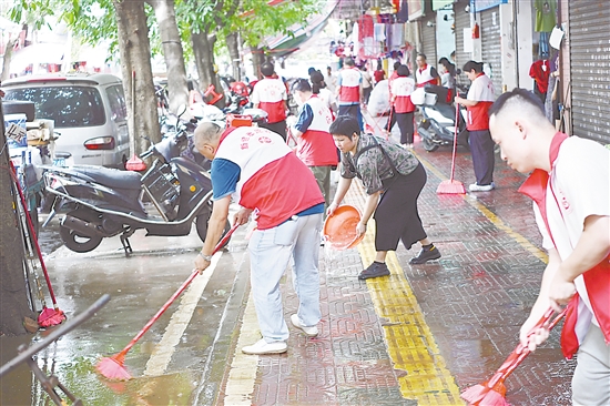 新会区三桥肇康市场前,午后的阳光里,两辆洒水车整齐排列,数十名佩戴党员徽章的志愿者手持清洁工具,有条不紊地清理市场内外。沿街的卫珍蔬菜店,卫姨弯腰接水,用一盆盆清水反复冲洗门前路面。“志愿者帮我们改善经营环境,我们肯定要搭把手。”她说。
