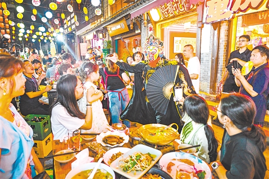 10月5日,重庆磁器口古镇摆起长街宴,吸引众多游客前来品美食、赏民俗表演,共迎中秋佳节。