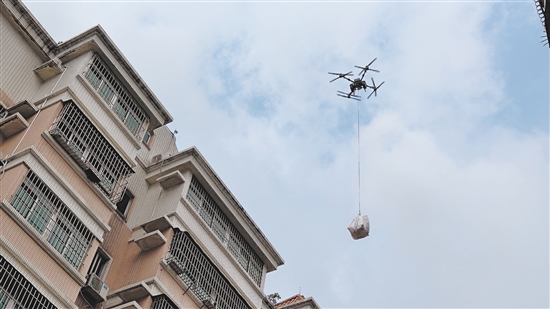 楼下,李坚绍操控无人机升空并到达目标楼顶时,楼顶另一名队员也能够通过操控器作为副手协助操控,确保无人机在楼顶环境下能够安全精准作业。仅用半分钟,一大包垃圾就从30米高的天台成功运至楼下集中堆放点。记者从李坚绍手中的无人机操控器数据记录中看到,当天上午该机单次飞行时长8分钟,载重数据达263.7公斤。