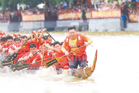 观众席上,群众擂鼓摇旗、呐喊助威。赛场上,新会泓达堂陈皮龙舟队来自不同民族的桨手们同坐一舟,目光如炬,动作整齐,每一次发力都传递着同舟共济的信念。赛场成为凝聚民族情感的生动课堂,展现了各民族交往交流交融的生动实践。