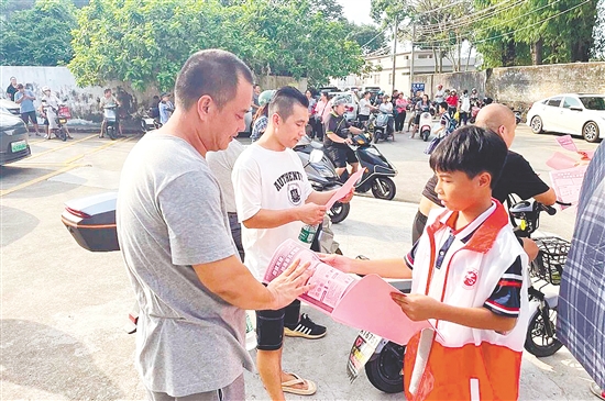 在台山市任远中学,放学时段的校门口成为特别的宣传阵地。教师和学生志愿者向等候接孩子的家长发放基孔肯雅热防控“七天七招”和“1130”宣传单,特别提醒家长定期清理花盆托盘、废弃容器等积水点。