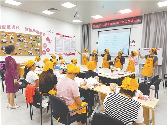 培训班上,讲师团队采用“理论讲解+实操演示+互动答疑”相结合的模式进行授课,将专业知识转化为广大妇女“听得懂、学得会、用得上”的实用技能。在小儿推拿培训课程中,讲师结合儿童的特点,系统讲解常见病症的推拿原理,并借助模拟玩偶现场演示推、揉、按等核心手法,手把手指导学员准确掌握穴位点位与操作力度。保育师培训课程则围绕婴幼儿生活照料、健康护理与早期启蒙等核心模块,通过案例分析和情景模拟等形式,帮助学员熟练掌握辅食制作、日常急救和行为引导等实用技能。讲师还在授课过程中提供就业指导,实现“学习+就业”双向助力。