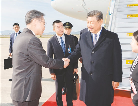 习近平抵达釜山金海国际机场时,韩国外长赵显等高级官员热情迎接。礼兵分列红地毯两侧致敬,军乐团演奏行进乐,机场鸣放21响礼炮。