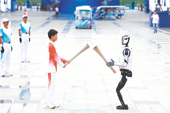 深圳站第三棒火炬手、中学生王裕宁从机器人“夸父”手中接过火炬,他说:“跟机器人面对面传递火炬,感觉非常科幻、非常奇幻。希望这次十五运会能够圆满举办,也希望通过十五运会能够让更多的青少年参与到体育运动当中。”