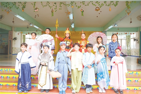 清晨的阳光透过窗户,洒在江门中港英文学校小学部的戏剧舞台上,来自土库曼斯坦的男孩阿特挥舞着羽毛扇,学着诸葛亮的样子捋着并不存在的胡须;舞台一角,来自也门的LuLu举起手中的小剑,用带着异国腔调却格外认真的中文念道:“穆桂英在此!”虽然动作还显稚嫩,但那专注的神情已初具巾帼英雄的神采……