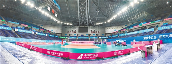 脚踩在赛场的专业木地板上,能明显感受到不同于普通地板的弹性。据介绍,运动员起跳落地时,该地板能有效吸收冲击力,最大程度减少运动损伤,助力她们发挥出最佳水平。再看四周,8500个蓝色座椅呈阶梯式排布,记者随机选了一个后排座位坐下,视线毫无遮挡,能清晰看到赛场每一个角落。