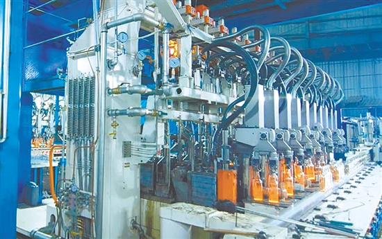 昨日,位于开平市苍城工业园的江门粤玻实业有限公司(以下简称“粤玻公司”)生产车间内的全自动生产线上,一只只透明的玻璃瓶顺着传送带快速移动,激光测量仪如火眼金睛般实时检测瓶身厚度,一旁的环保设备平稳运行,将处理后的废气通过烟囱排出。