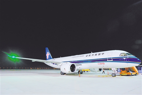图为11月14日凌晨在阿联酋迪拜阿勒马克图姆国际机场拍摄的一架中国南方航空C919飞机。