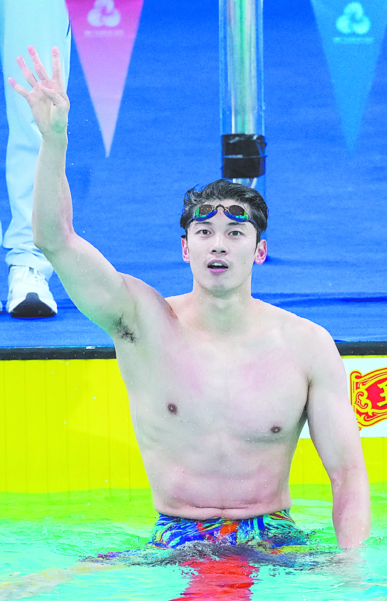 新华社深圳11月14日电 1分56秒20!出水后的汪顺,向看台上的观众伸出四根手指比“4”,寓意在该项目完成了全运会四连冠。