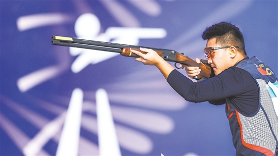 男子飞碟双向比赛中,两名江苏队选手张煜坤、杨蒋携手进入最后10枪的争夺。首次参加全运会的张煜坤稳住心态,以56中的成绩笑到最后。杨蒋和福建队选手吴亮亮分获银牌和铜牌。