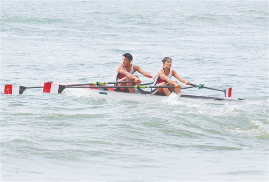 当天,位于阳江市海陵岛的海岸赛艇比赛现场风浪不断,给各参赛队伍都带来一定挑战。“这个项目肯定会有风浪,我们此前也做过针对性训练,尤其是在借浪等细节上比较注重。”广东海岸赛艇队教练李家豪说。