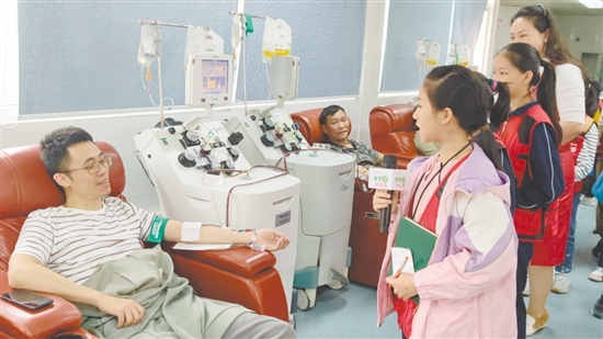 在献血大厅,小记者们近距离观察献血登记、体检、采血等全流程操作,还在采血室与无偿献血者面对面交流,聆听他们的爱心故事。在采访环节,小记者们早已做好准备,围拢到正在献血的志愿者身边。“叔叔,您为什么会想到来献血呀?”“第一次献血会不会紧张?”“献血过程会不会有什么不舒服?”面对小记者们的连环提问,志愿者耐心分享自己的献血经历。“我已经连续献血14年,今天是第167次献血,能帮助别人,我觉得特别有意义。”正在捐献成分血的市民的经历让小记者们肃然起敬。