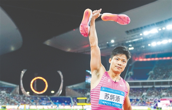 当日,田径项目依然是金牌大户,共产生12枚金牌。36岁的男子100米亚洲纪录保持者苏炳添成为全场焦点,他在家门口的赛道上跑完了职业生涯的最后100米,带领一众“00后”队友为广东队夺得男子4×100米接力第四名。尽管未能帮助家乡队伍站上领奖台,但苏炳添仍赢得了满场掌声。