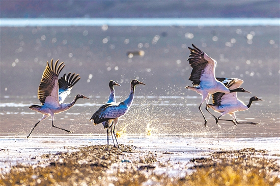 冬日时节,西藏拉萨市林周县迎来大批越冬候鸟,黑颈鹤、斑头雁、赤麻鸭等候鸟在河谷、湖泊等地觅食、休憩。上图、右图均为11月23日在林周县拍摄的越冬候鸟。 新华社发