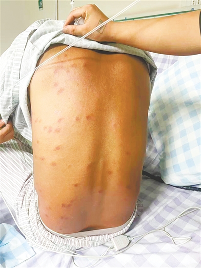 事发当日,代先生不慎惊扰了马蜂,瞬间被群蜂围攻,全身多处被蜇伤。针扎般的剧痛尚未平息,可怕的症状接踵而至:全身迅速红肿,呼吸变得异常困难。“当时感觉胸口像压了块大石头,喘不上气,眼前发黑,身上全是冷汗。”回忆起初时的场景,代先生仍心有余悸。