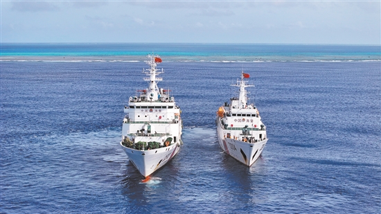 11月8日,中国海警舰艇在黄岩岛海域执行常态化巡航任务(无人机照片)。