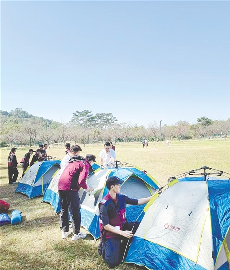 当日清晨7时30分,3支救援队在圭峰山脚下集结。随着总指挥一声令下,拉练正式启动。队员们背负沉重的救援装备,沿预定路线急行。抵达预定区域后,各队迅速投入营地搭建。队员们分工协作,很快,一顶顶医疗帐篷和指挥帐篷在林间空地拔地而起,确保了在野外条件下的自我保障能力。
