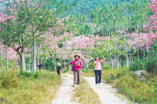 游客们漫步在蜿蜒的花间小径上,或驻足赏花、或拍照留念,尽情享受大自然的美景。“我们是被摄影博主的视频‘种草’,专程从中山驱车来的。看到这片粉色的花海,感觉秋冬都变得温暖和浪漫起来了。”来自中山的游客张先生表示。“每年这个时候我们都会来粉洞村赏花,最近天气特别好,蓝天白云下的异木棉格外好看。在‘家门口’就能看到这么漂亮的花海,感觉特别满足。”市民吴女士说。