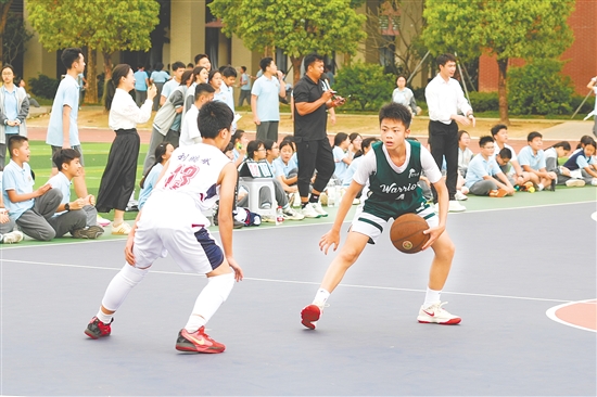 基于这些观察,郑春与学校领导、体育教师系统研究体育教育,发现篮球这项融合个人技艺与团队协作的运动,正契合青少年成长的多重需求。经过多方考量,学校决定把打造篮球特色作为重要工作。“我们要做的,不仅是培养篮球拔尖人才,更要让每个对篮球有兴趣的孩子都能在这项运动中收获成长。篮球场上学的不仅是投篮技巧,更是人生的必修课——如何在规则中追求自由,在竞争中学会尊重,在失败中懂得坚持。”郑春说。