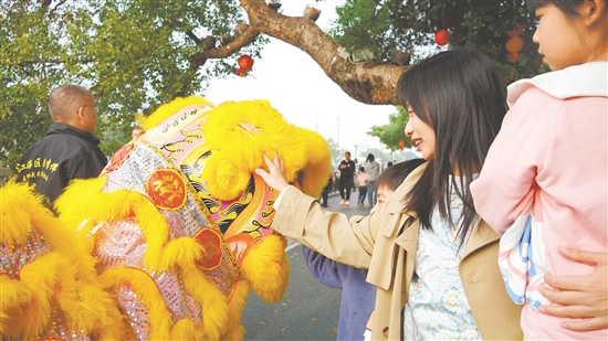 江海醒狮巡游吸引市民游客摸狮头接好运。陈婵 摄