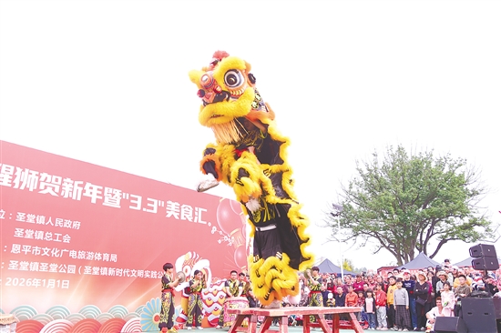 江门日报讯 (文/图 记者/周晓营 谭锦波) 2026年1月1日中午,圣堂镇圣堂公园人头攒动,市民、游客里三层外三层聚集在公园篮球场,一边品尝地道美食,一边观赏醒狮贺年,热闹非凡。据悉,该镇自去年举办醒狮贺新年活动后,今年连续三天举办醒狮贺新年暨三点三美食汇活动,为本土特色美食和优质农产品搭建展示、推广、销售平台,通过品味乡味,让群众感受家乡发展变化,共享发展成果。
