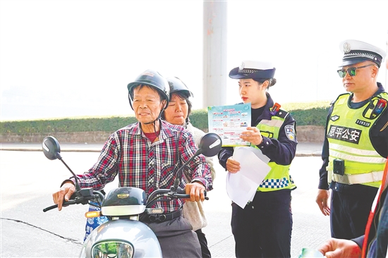 江门日报讯 (文/图 记者/朱磊磊 通讯员/曹晶) 为切实增强老年群体的交通安全意识,筑牢道路安全防线,近日,江门市各辖区交管部门结合本地实际,围绕老年人出行特点集中开展了一系列形式多样、内容精准的电动自行车、摩托车交通安全主题宣传活动,将安全知识送到老年人身边,用心守护“夕阳红”出行平安。