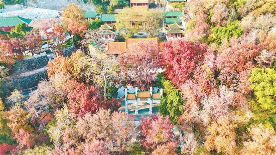 近看,玉台寺的黄墙黛瓦与漫天红叶相映成趣。远眺主峰,层层叠叠、错落分布的红叶带与阔叶林的黄绿色交织在一起,犹如画家以最饱和的颜料在青山上肆意挥洒。行走其间,脚下是沙沙作响的落叶地毯,抬头是遮天蔽日的红色穹顶,这便是让人沉醉的“圭峰红叶”,成为市民游客休闲赏景、拍照打卡的热门之地。“我每一年都过来赏枫,今年入冬经历了大降温,枫叶格外红,拍照效果特别好。”来自佛山的摄影爱好者赵先生说。他今年在圭峰山拍摄期间认识了3位摄影同好,已约定明年一同再来。